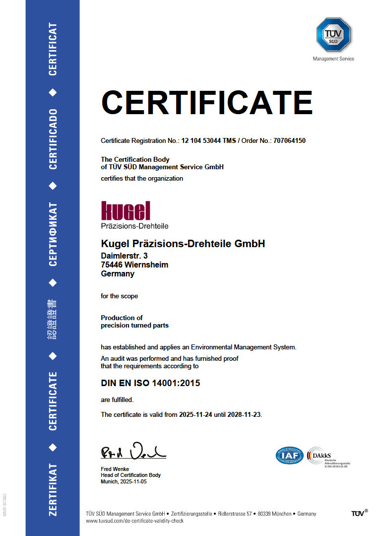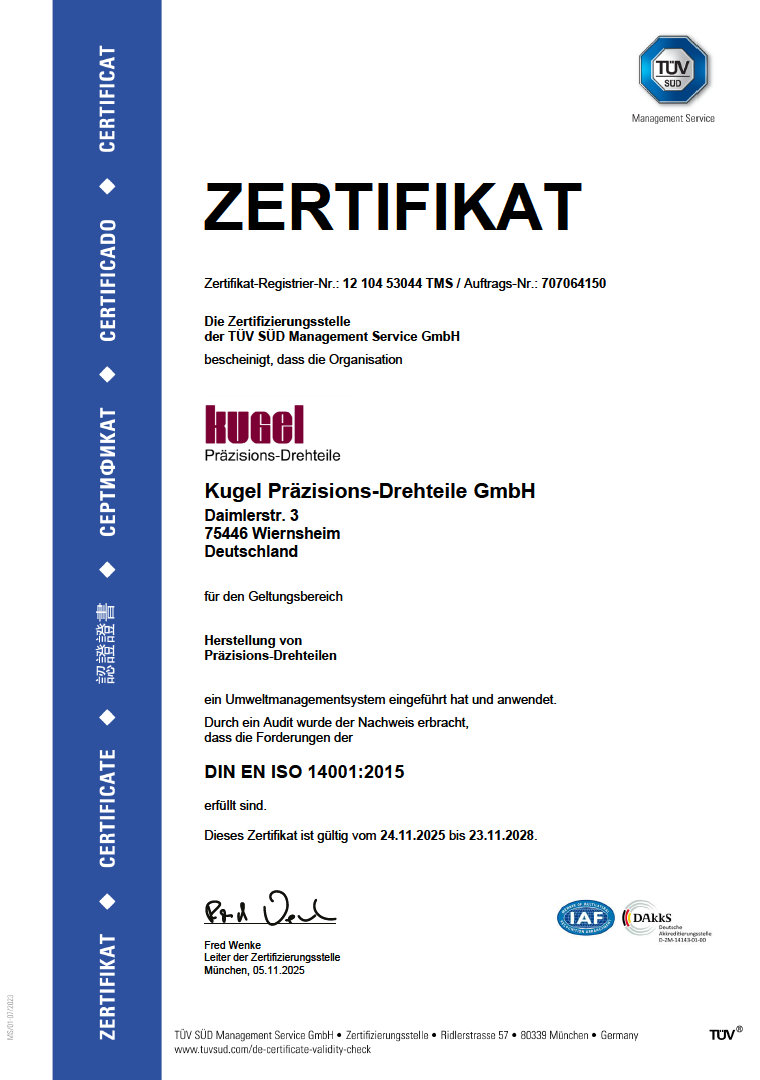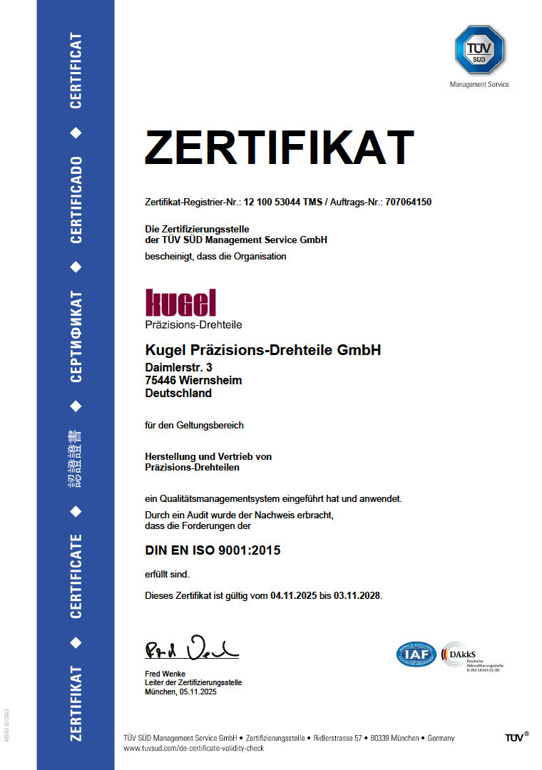 Alle Prozesse wurden selbstverständlich gemäss den Normen ISO 9001 und IATF 16949 bei der Kugel Präzisions-Drehteile GmbH zertifiziert.