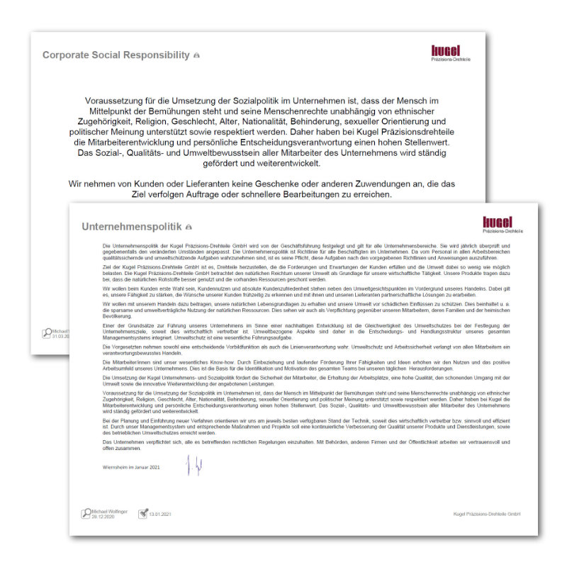 Zur Erreichung der Qualitäts- und Umweltziele lebt die Kugel Präzisions-Drehteile GmbH eine Unternehmenspolitik, die Sie hier im Detail einsehen können: PDF-Dokument öffnen (370 KB).